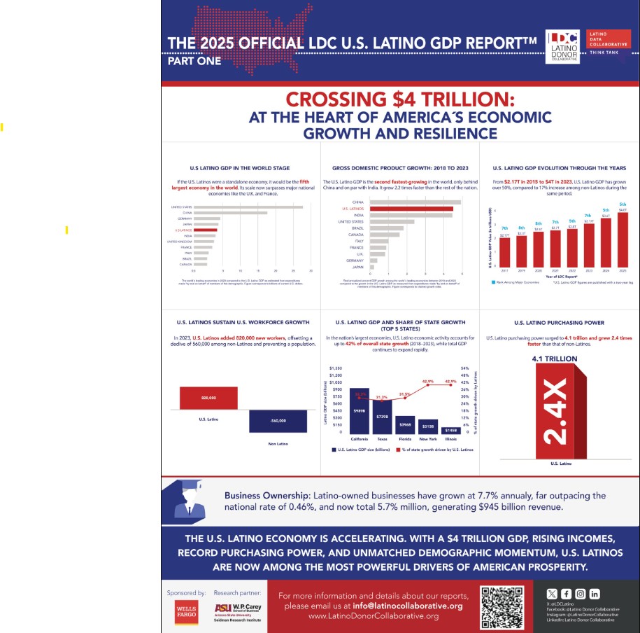 The 2025 Official LDC U.S. Latino GDP Report™ confirms that the U.S. Latino GDP has reached a historic $4 trillion, ranking as the 5th largest economy in the world if considered independently. This groundbreaking analysis, produced by the Latino Donor Collaborative (LDC) in collaboration with the W. P. Carey School of Business at Arizona State University and sponsored by Wells Fargo, showcases the unmatched speed, scale, and resilience of Latino economic growth.